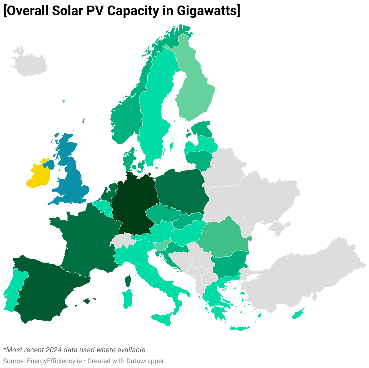 To calculate the photovoltaic solar PV capacity per capita in Ireland, the United Kingdom and mainland Europe, we first looked at the overall capacity in each country for which recent data was available. For Ireland and the UK, this data was updated in 2024.