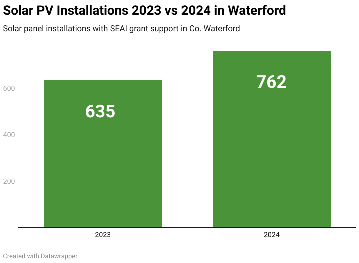 There was an 18% increase in solar arrays in Waterford last year – up from 635 in 2023 to 762 in 2024. Met Éireann data shows Waterford is one of the sunniest counties in Ireland, meaning households in the county can generate more free electricity from solar than other counties.