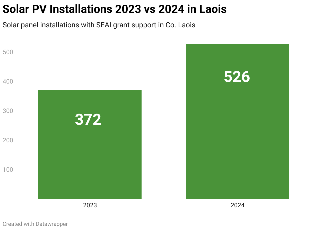 Laois households installed solar panels on their rooftops in their droves last year, with a total of 526 installations carried out over the course of the year. It was an increase of 154, or 34% from 2023 when there were 372 solar arrays fitted in Co. Laois.
