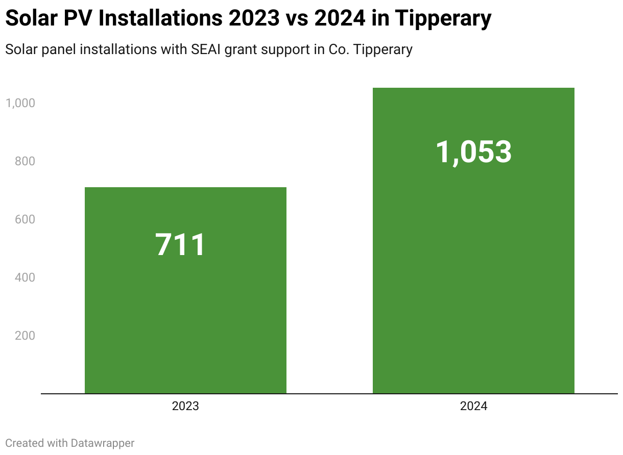 Over 1,000 homes installed solar panels in Tipperary in 2024, with the county recording a 39% increase in installations. The final figure for the county was 1,053 at the end of the year, and 2025 could be another record year for solar in the county if the trend continues.