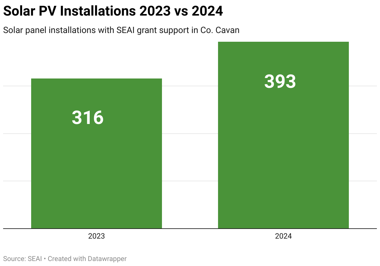 Co. Cavan has one of the lowest solar adoption rates per capita in Ireland, but there were promising signs in 2024 with a 21.7% increase in solar panel systems being installed., slightly below the national average of 24%. A total of 393 solar installations were carried out in the county in 2024 compared to 316 in 2023, representing an increase of 77.
