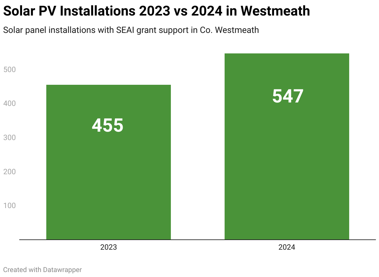 Westmeath saw 547 new solar panel systems installed in 2024, an increase of 92 from 2023. This was an 18% increase in installations, which was below the national average increase for solar adoption last year which was 25%.