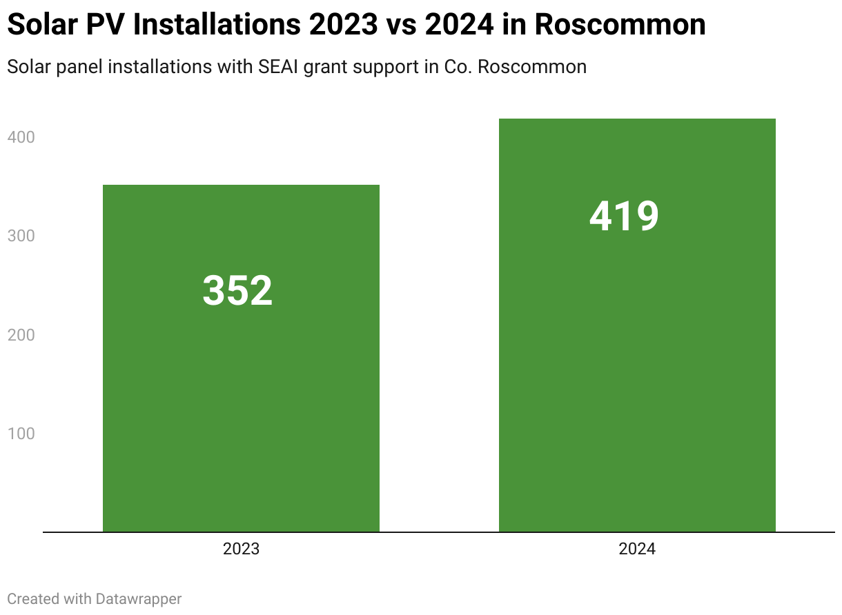 There were 67 more PV installations in Co. Roscommon in 2024 compared to 2023, with a total of 419 last year. This represented an increase of 17% – which was one of the lower figures recorded in the end of year SEAI data.