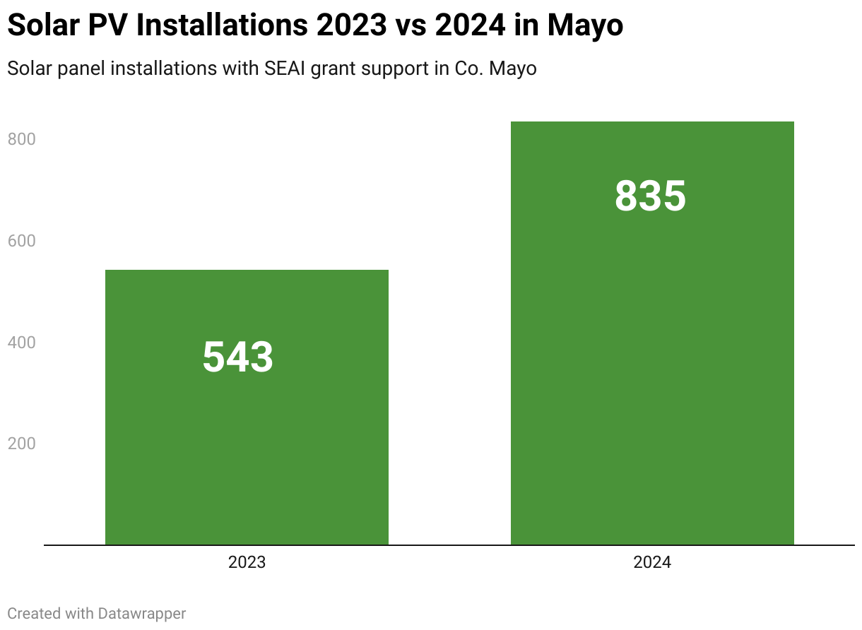 Co. Mayo saw the second highest percentage increase in solar panels being installed in 2024 in Ireland at 42% – one of only three counties where there was a rise of over 40%. A total of 835 grants were awarded for solar panel systems to be installed in Mayo in 2024, an increase of 292 from 2023.
