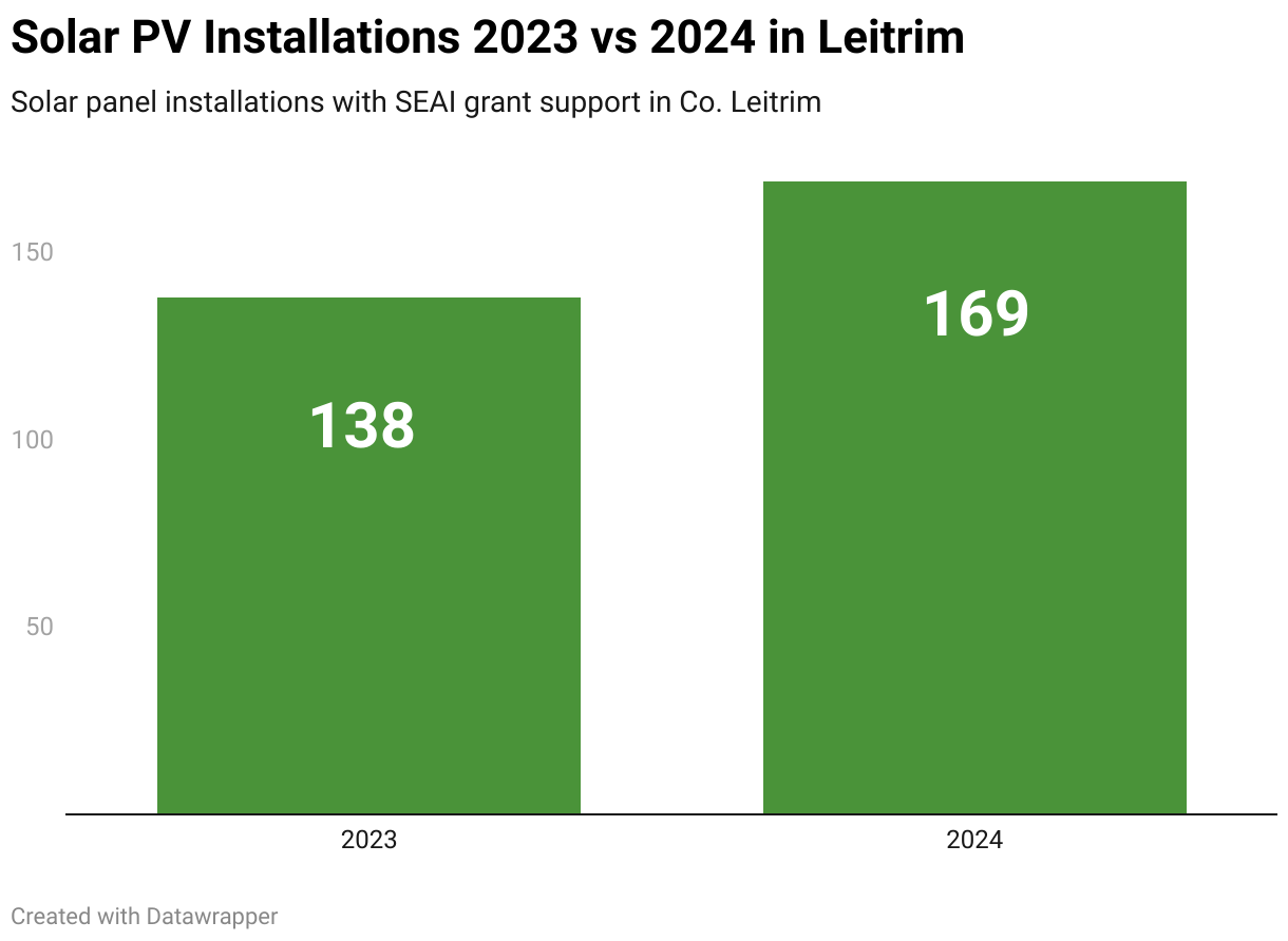 Leitrim has one of the lowest overall installation rates in Ireland as well as one of the lowest rates of solar uptake per capita. However, there was a 20% increase in the number of homes that adopted solar in 2024. A total of 169 solar panel systems with grant support were installed in the county last year, an increase of 31 (+20%) from 2023.