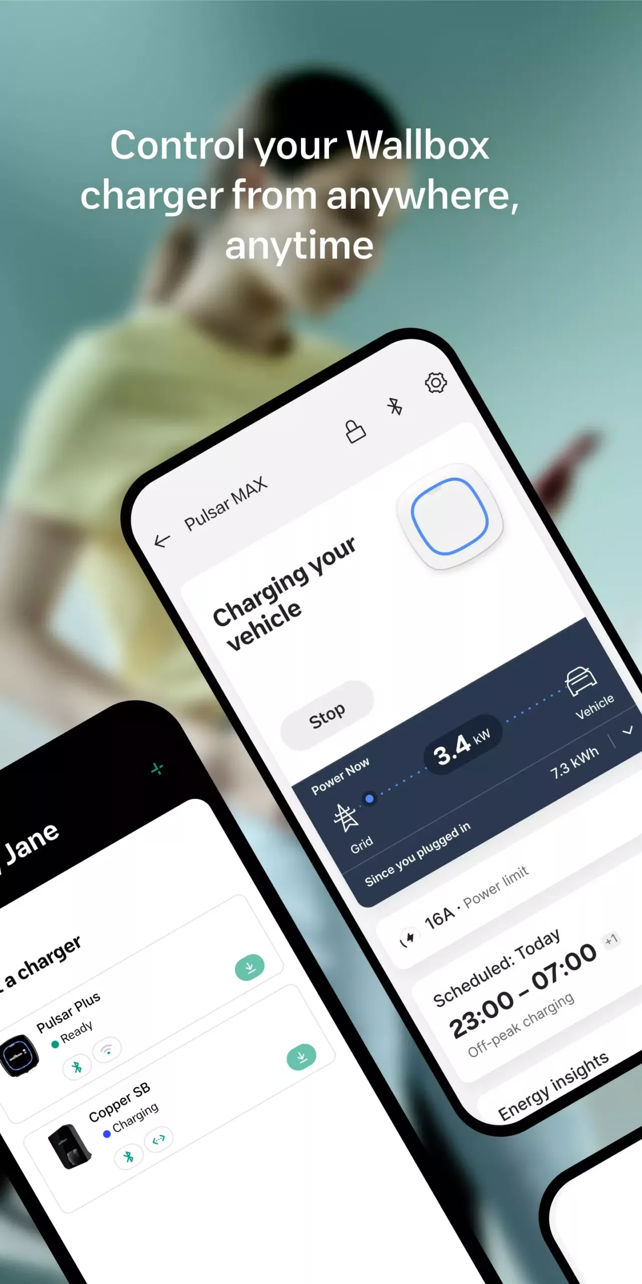 Manual Control: Stop and start charging sessions with the push of a button when you need to override set schedules and charge immediately.