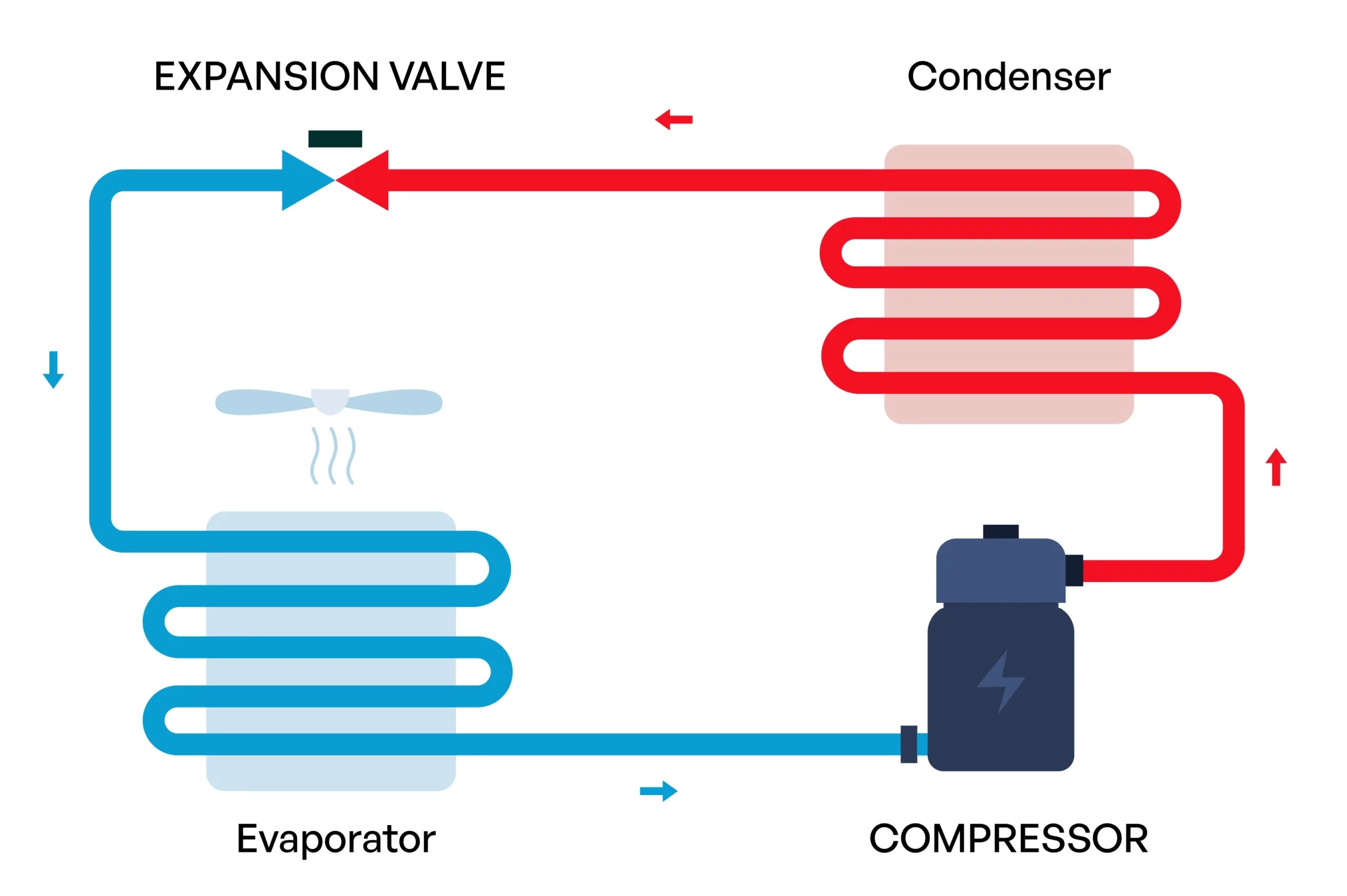 Expansion (Further Reduction of Heat & Pressure): The refrigerant passes through the expansion valve, lowering its temperature further and reducing the pressure it is under. It is now in a semi-liquid, semi-gaseous state and returns to the start of the cycle at the evaporator.