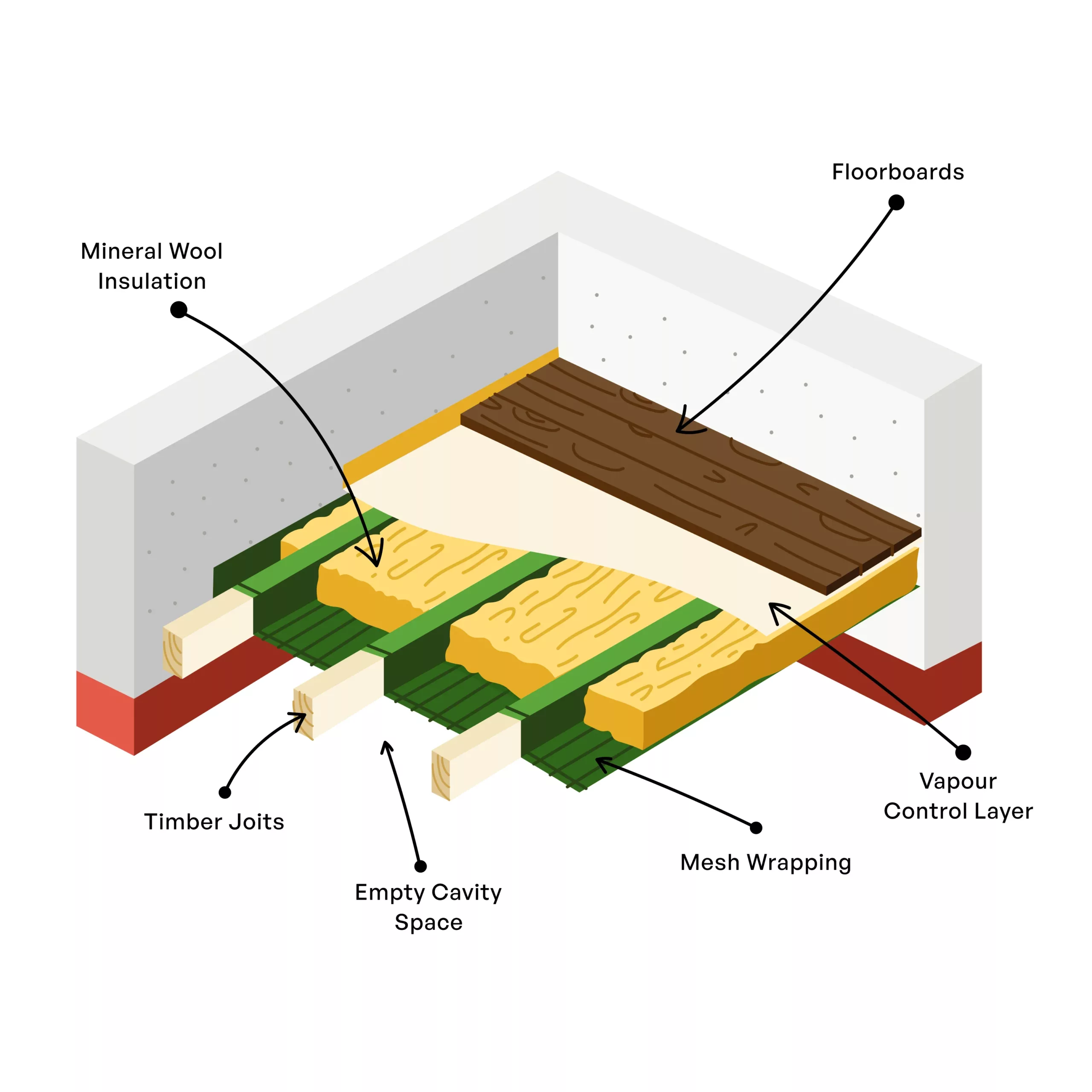 With suspended timber floors the insulation will be placed between the joists, and covered with a vapour layer to ensure that they are airtight and protected from moisture.